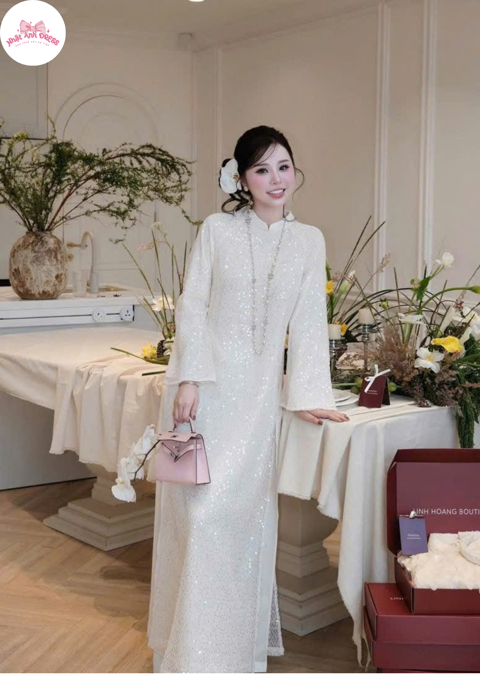 Thiết kế áo dài trắng thanh khiết, điểm xuyết kim sa ánh kim nhẹ nhàng, mang lại vẻ đẹp tinh tế nhưng vẫn nổi bật. Phù hợp với phong cách nhẹ nhàng, trang nhã và các concept chụp ảnh truyền thống.
