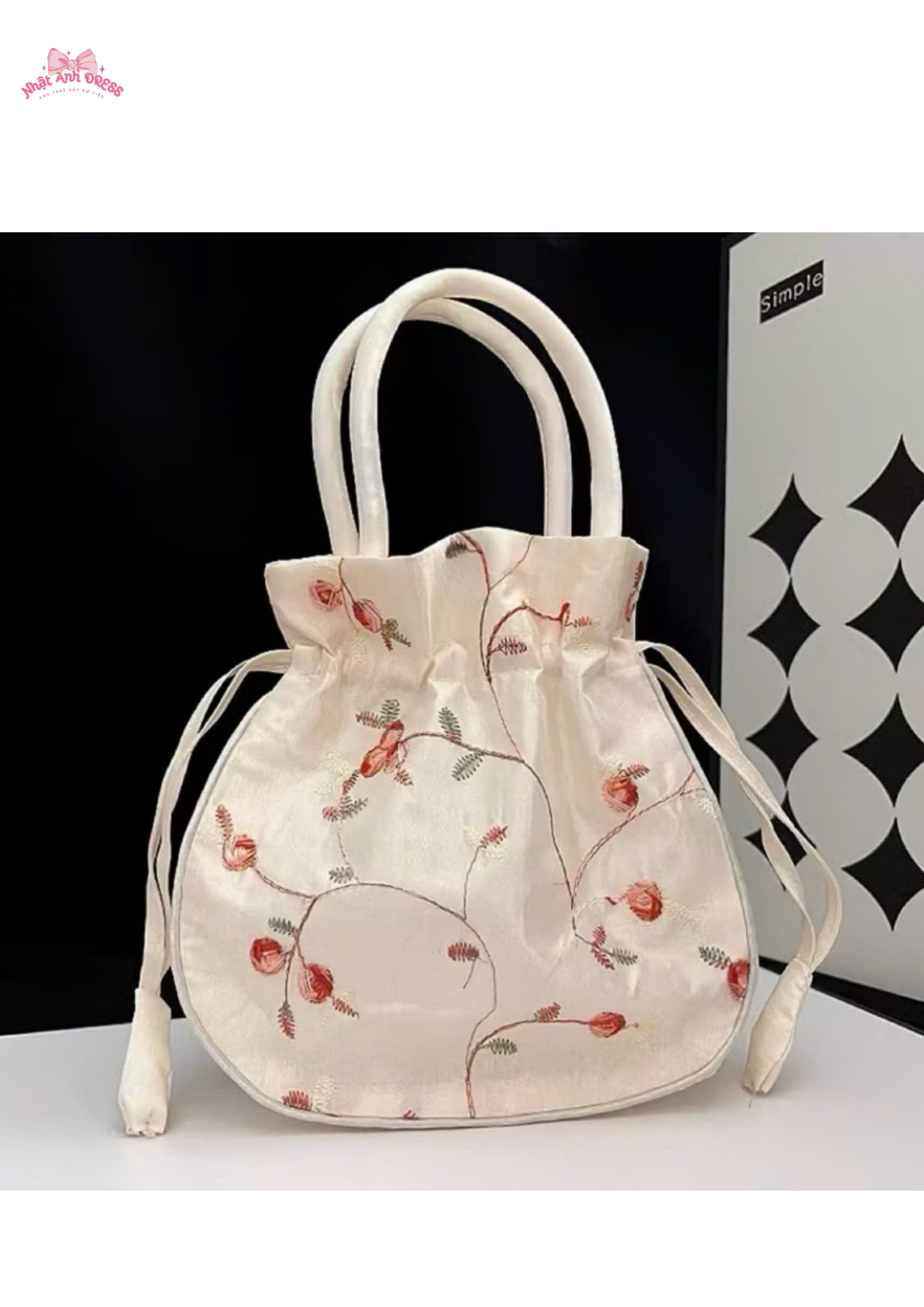 Túi lụa mềm mại, họa tiết hoa thêu tinh xảo, thiết kế dây rút tiện lợi. Phụ kiện hoàn hảo khi phối cùng áo dài và váy nữ tính.
