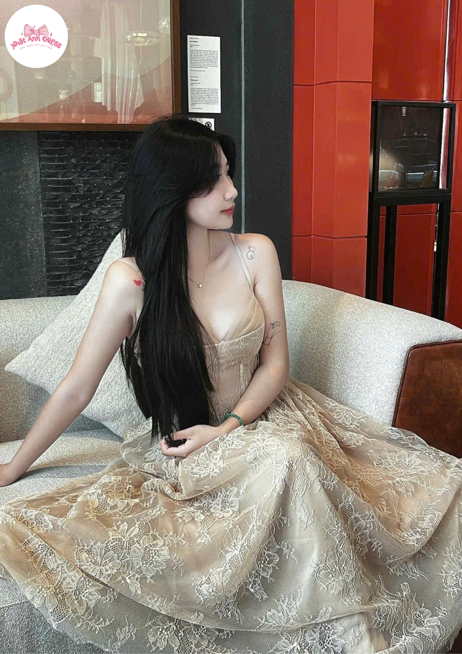 Thiết kế cổ V 2 dây quyến rũ vừa đủ, kết hợp ren hoa tinh tế. Váy mang vẻ đẹp sang trọng, nữ tính, giúp người mặc nổi bật trong mọi bữa tiệc.